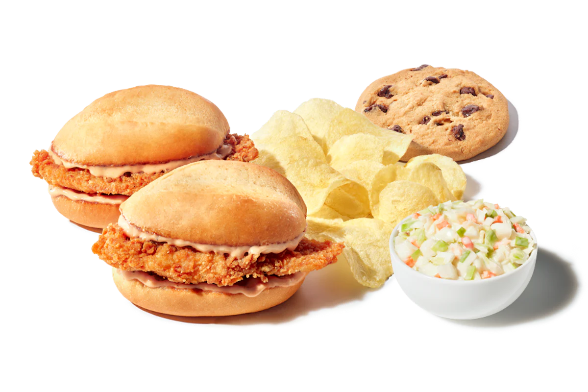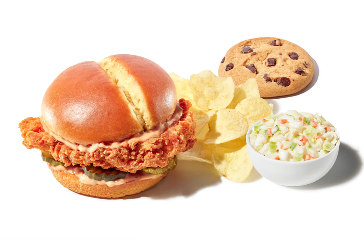 Hand-breaded Chicken Fillet and dill pickles on a toasted potato bun with Zax Sauce® and Spicy Zax Sauce® on the side. Add on Chips, Coleslaw, and Chocolate Chip Cookie for additional charge.