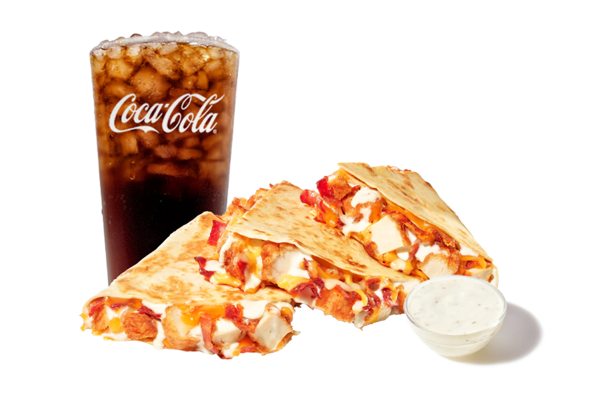 A Giant Quesadilla packed with 3 hand-breaded Chicken Fingerz™, Cheddar Jack cheese, hardwood smoked bacon and Ranch on a flour tortilla. Served with Ranch and Small Drink.
