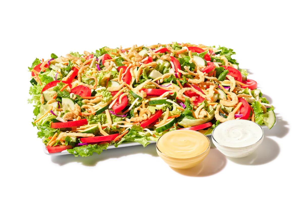 Mixed greens with carrots and red cabbage, Cheddar Jack cheese, cucumbers, tomatoes, and fried onions with choice of dressings. Includes Texas Toast Platter. Serves 12-14.