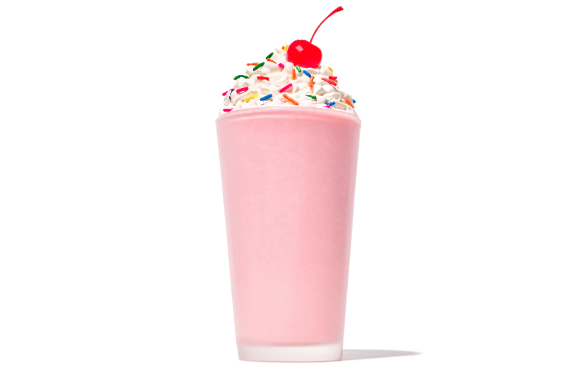 A hand-spun strawberry milkshake topped with whipped cream, sprinkles, and a cherry. Only available in size Small.