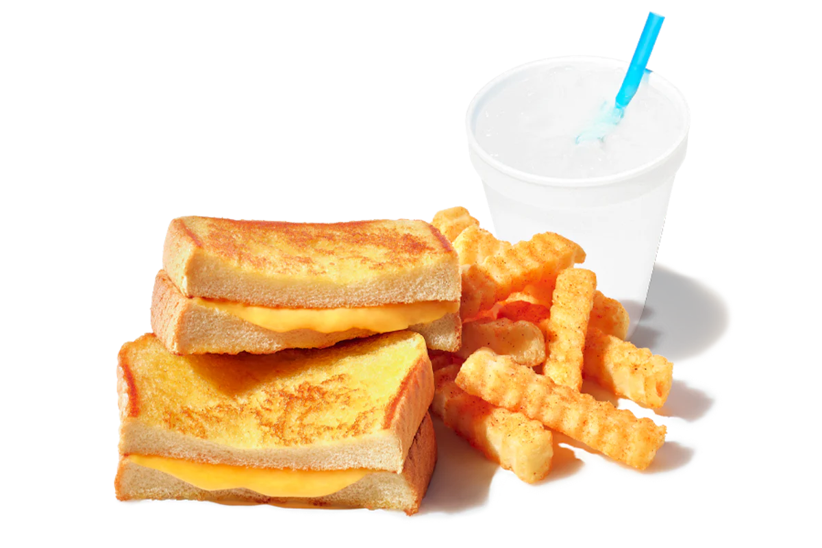 A classic grilled cheese – American Cheese on Texas Toast. Served with Crinkle Fries, Treat, and Kids Drink.