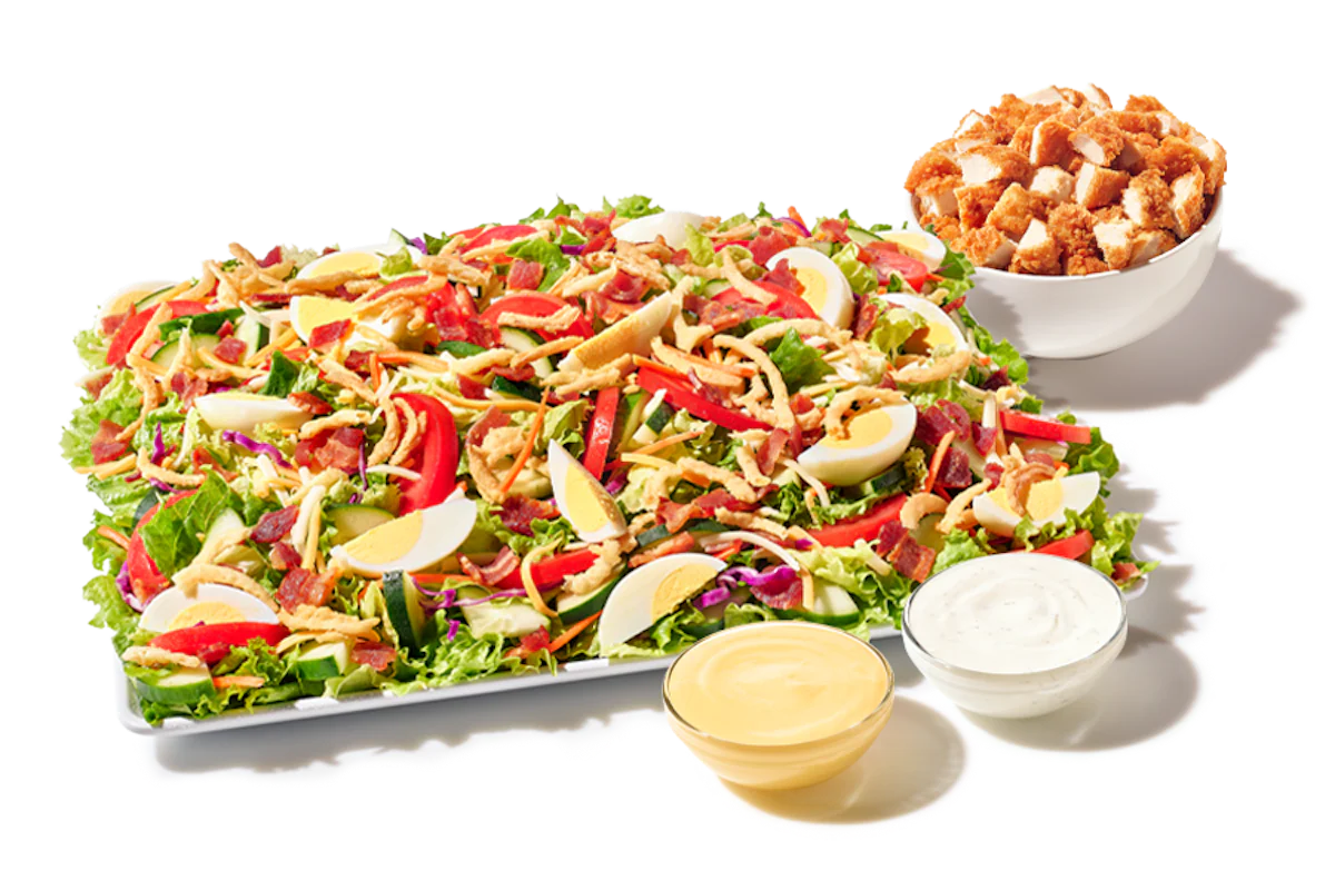 Mixed greens with carrots and red cabbage, Cheddar Jack cheese, natural hardwood smoked bacon, hard-boiled egg, cucumbers, tomatoes, and fried onions with Fried and/or Grilled Chicken and choice of dressings. Includes Texas Toast Platter. Serves 12-14.