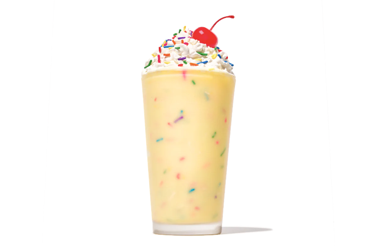 A hand-spun birthday cake milkshake mixed with sprinkles and topped with whipped cream, sprinkles, and a cherry. Only available in size Small.