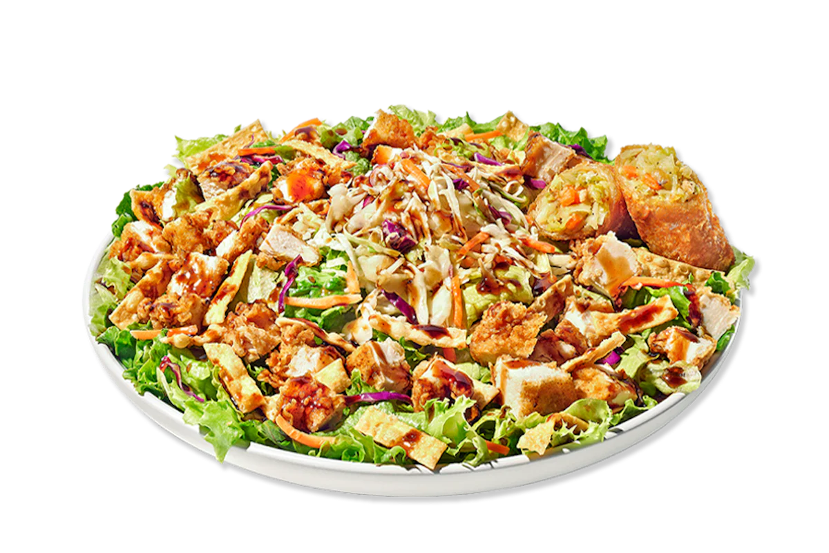 Mixed greens with carrots and red cabbage, wonton strips, Asian Slaw, and a drizzle of Teriyaki Sauce with Fried or Grilled Chicken and Citrus Vinaigrette. Served with Veggie Egg Roll.
