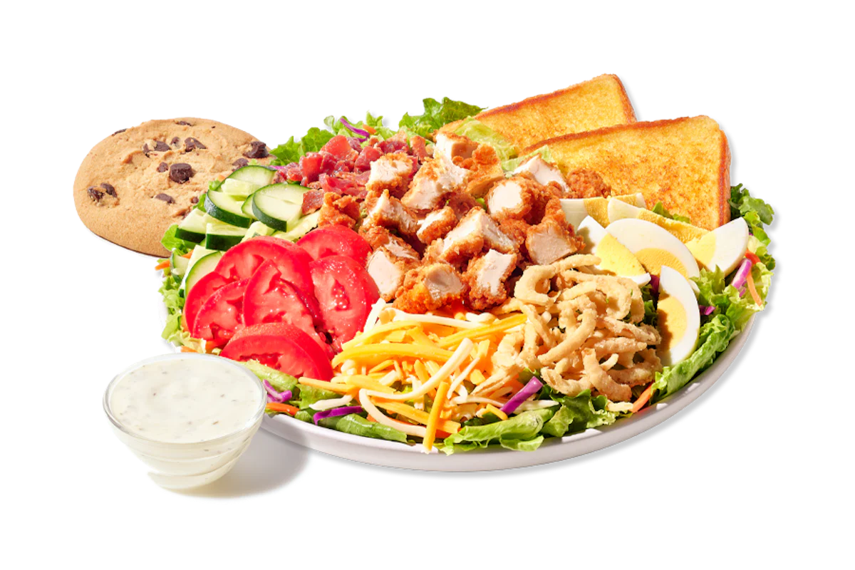 Mixed greens with carrots and red cabbage, Cheddar Jack cheese, natural hardwood smoked bacon, hard-boiled egg, cucumbers, tomatoes, and fried onions with Fried or Grilled Chicken and your choice of dressing. Served with Texas Toast. Add on Chips, Coleslaw, and Chocolate Chip Cookie for additional charge.