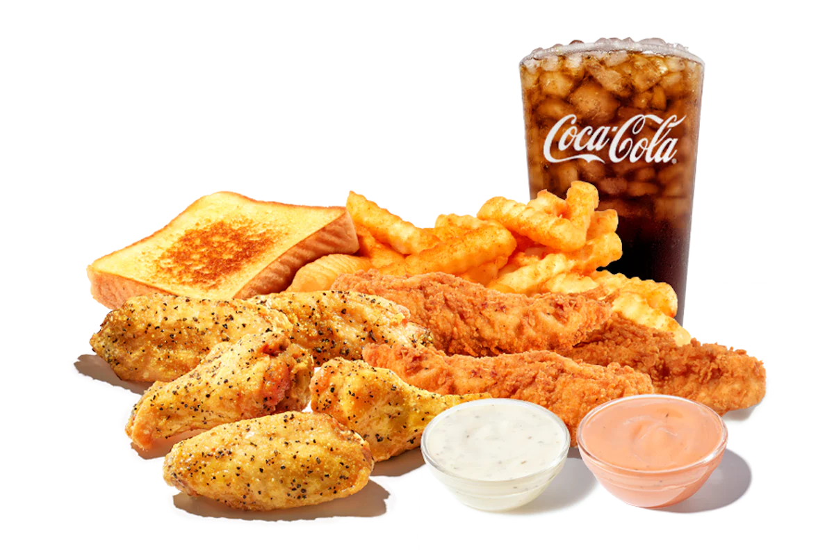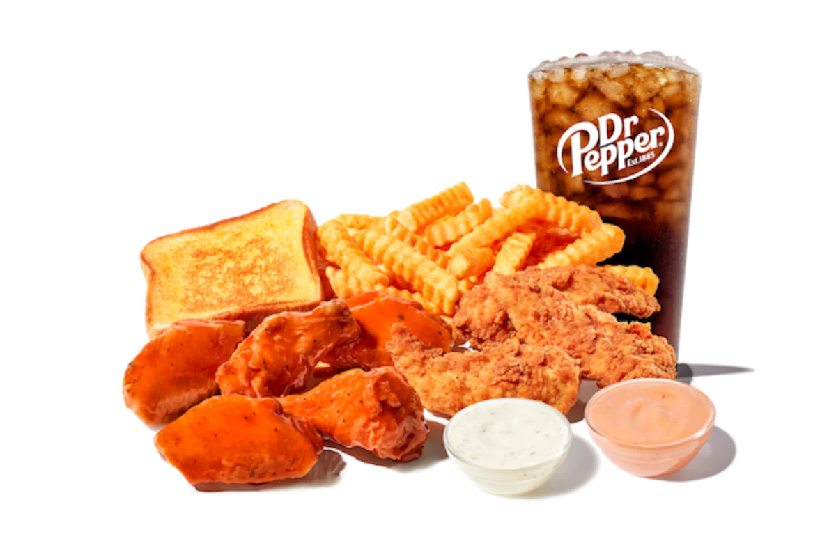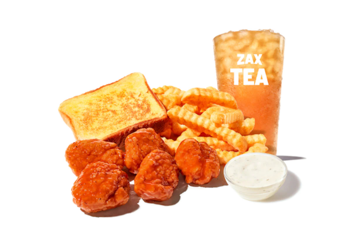 5 Boneless Wings made from all-white breast meat or 5 Traditional Wings tossed in your choice of sauce with Ranch, plus 3 Chicken Fingerz™ with Zax Sauce®. Served with Texas Toast, Crinkle Fries, and Small Drink.
