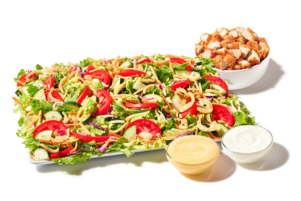 Mixed greens with carrots and red cabbage, Cheddar Jack cheese, cucumbers, tomatoes, and fried onions with Fried and/or Grilled Chicken and choice of dressings. Includes Texas Toast Platter. Serves 12-14.