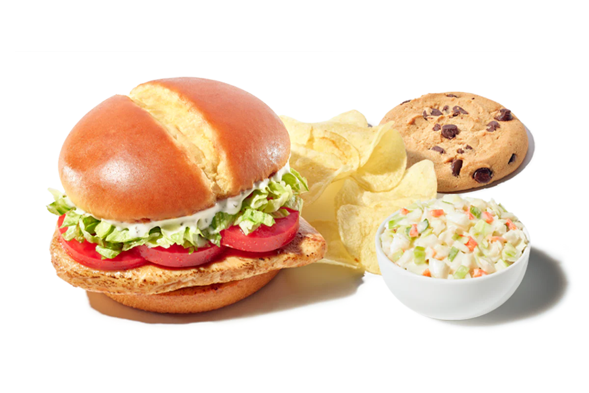 Grilled Chicken Fillet, lettuce, and tomatoes on a toasted potato bun with Ranch on the side. Add on Chips, Coleslaw, and Chocolate Chip Cookie for additional charge.