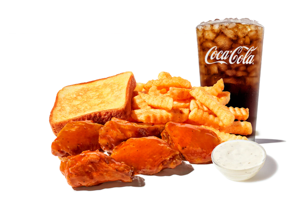 8 Boneless Wings made from all-white breast meat tossed in your choice of sauce. Served with Ranch, Texas Toast, Crinkle Fries, and Small Drink.
