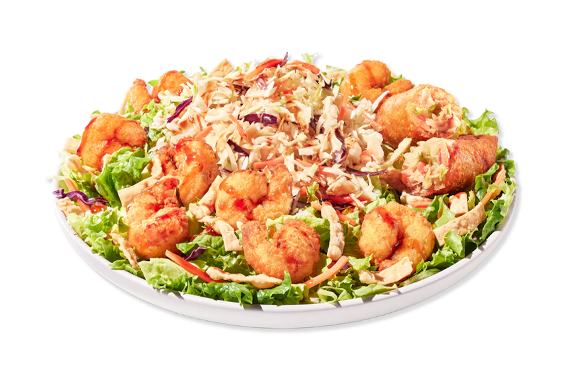 Mixed greens with carrots and red cabbage, wonton strips, Asian Slaw, and a drizzle of Teriyaki Sauce with crispy Southern Fried Shrimp and Citrus Vinaigrette. Served with Veggie Egg Roll.