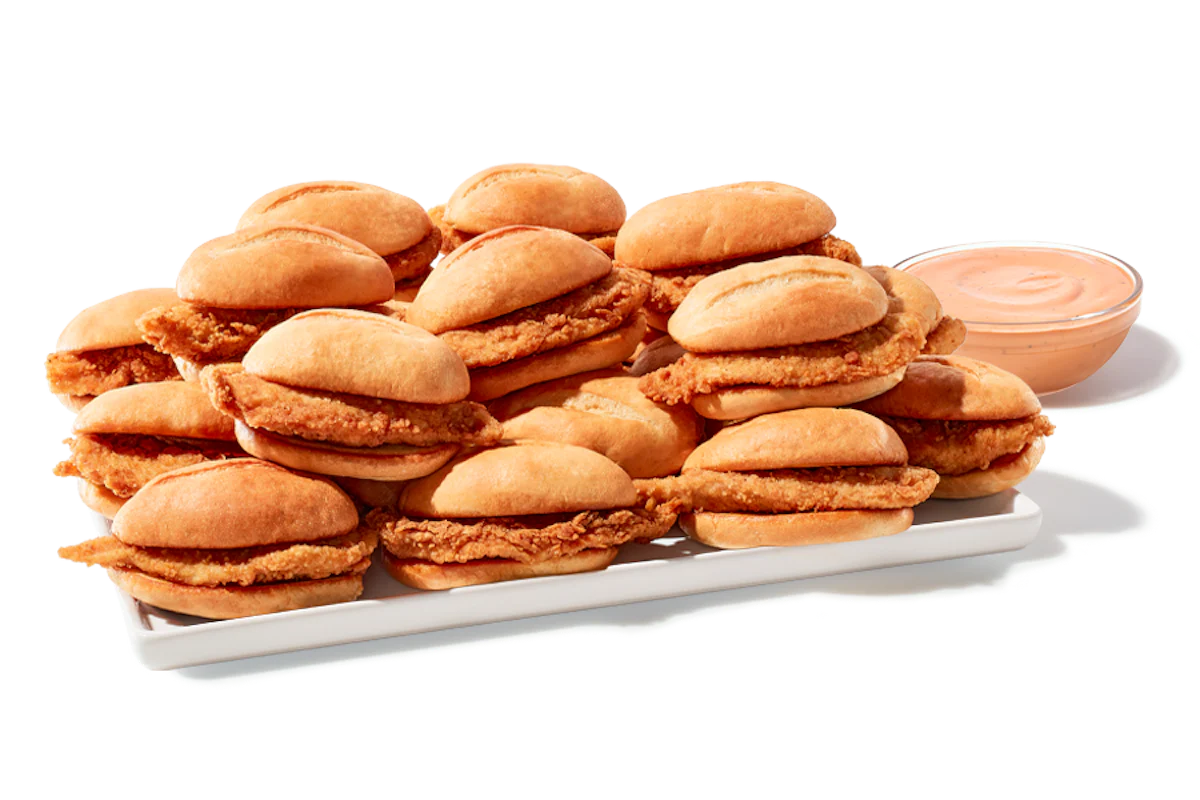 20 Nibblerz® – hand-breaded Chicken Fingerz™ and Zax Sauce® on toasted buns. Serves 12-14.