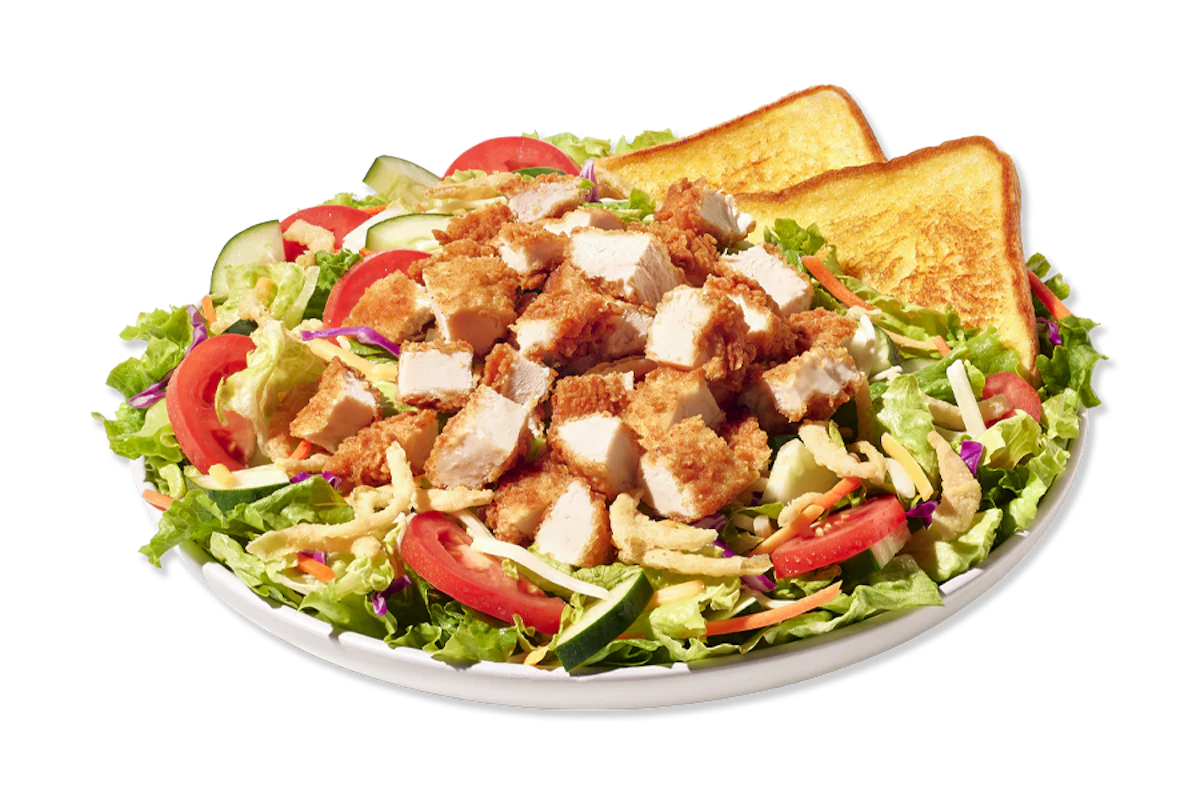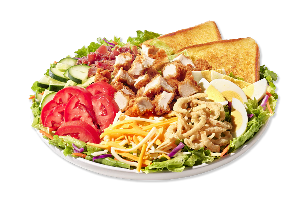 Mixed greens with carrots and red cabbage, Cheddar Jack cheese, natural hardwood smoked bacon, hard-boiled egg, cucumbers, tomatoes, and fried onions with Fried or Grilled Chicken and your choice of dressing. Served with Texas Toast.