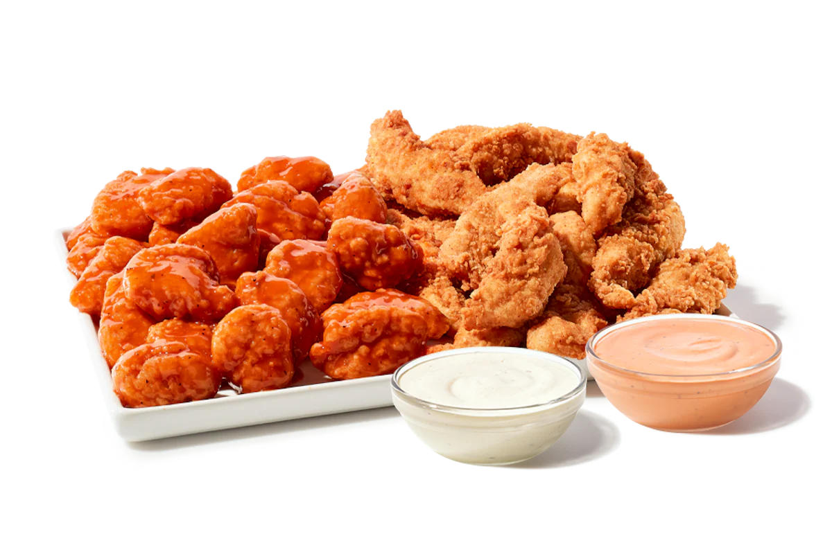 60 Boneless Wings made from all-white breast meat tossed in your choice of sauce, served with Ranch. Serves 12-14.
