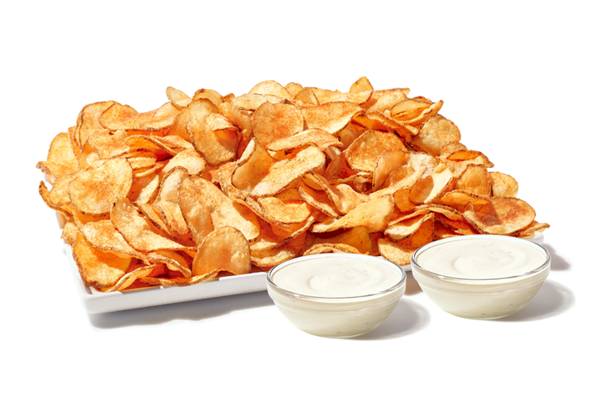 A crispy, crunchy, crowd-pleasing platter of tater chips, served with Ranch dipping sauce. Bagged crisps never stood a chance. Serves 12-14.