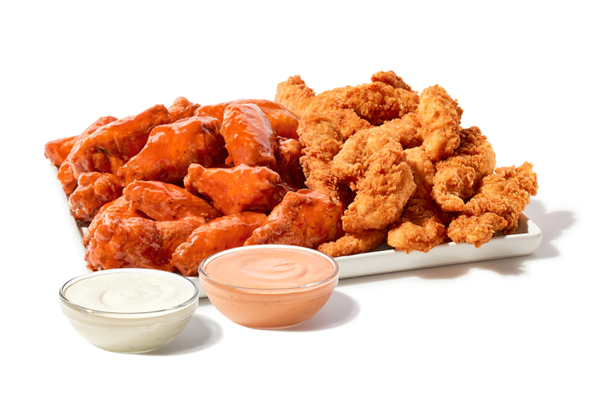 20 hand-breaded Chicken Fingerz™ with Zax Sauce® and 20 Traditional Wings tossed in your choice of sauce, served with Ranch. Serves 12-14.