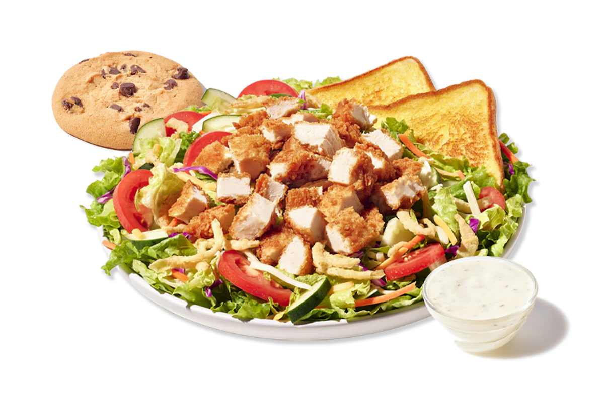 Mixed greens with carrots and red cabbage, Cheddar Jack cheese, cucumbers, tomatoes, and fried onions with Fried or Grilled Chicken and your choice of dressing. Served with Texas Toast. Add on Chips, Coleslaw, and Chocolate Chip Cookie for additional charge.