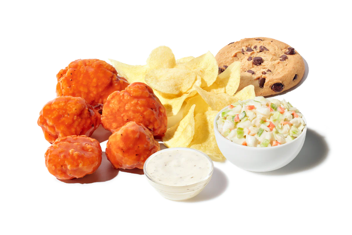 5 Boneless Wings made from all-white breast meat tossed in your choice of sauce. Add on Chips, Coleslaw, and Chocolate Chip Cookie for additional charge.